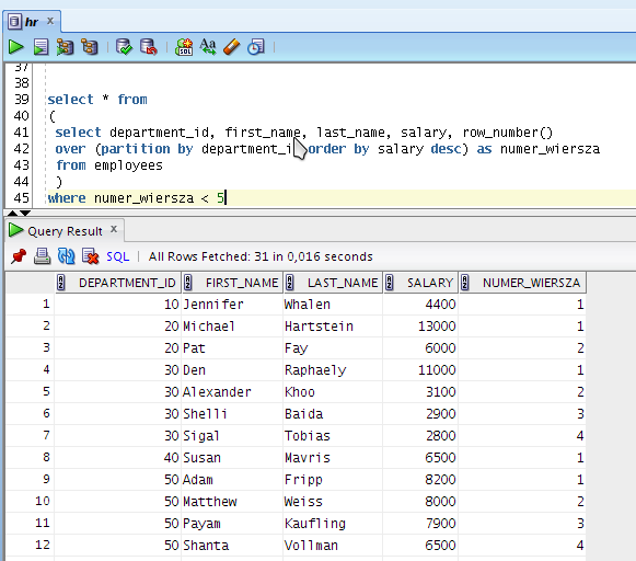 W Oracle jest funkcja rownum (jest to coś innego niż row_number()) która podczas generowania wyniku nadaje każdemu kolejnemu wierszowi kolejny numer. Działa trochę jak samoodnawiająca się sekwencja. Bez wykorzystania podzapytań (o tym dalej) możemy ją wykorzystać do ograniczenia tylko początkowej sekcji wierszy.